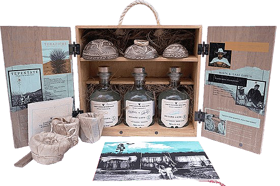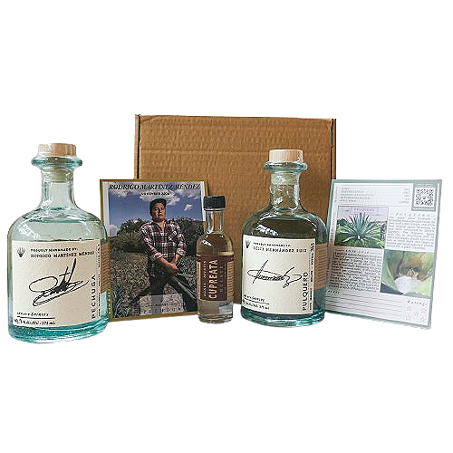 The Melate Signature Box (The Starter Kit Deluxe): This is a standout. It includes three 375mL bottles of diverse maguey varieties (like Tepextate, Tobaziche, and Madre Cuixe), along with handmade accessories—including a beautiful pine wood box, clay copitas, and a hand-carved jicara. It’s a complete tasting kit and a piece of Oaxacan art.