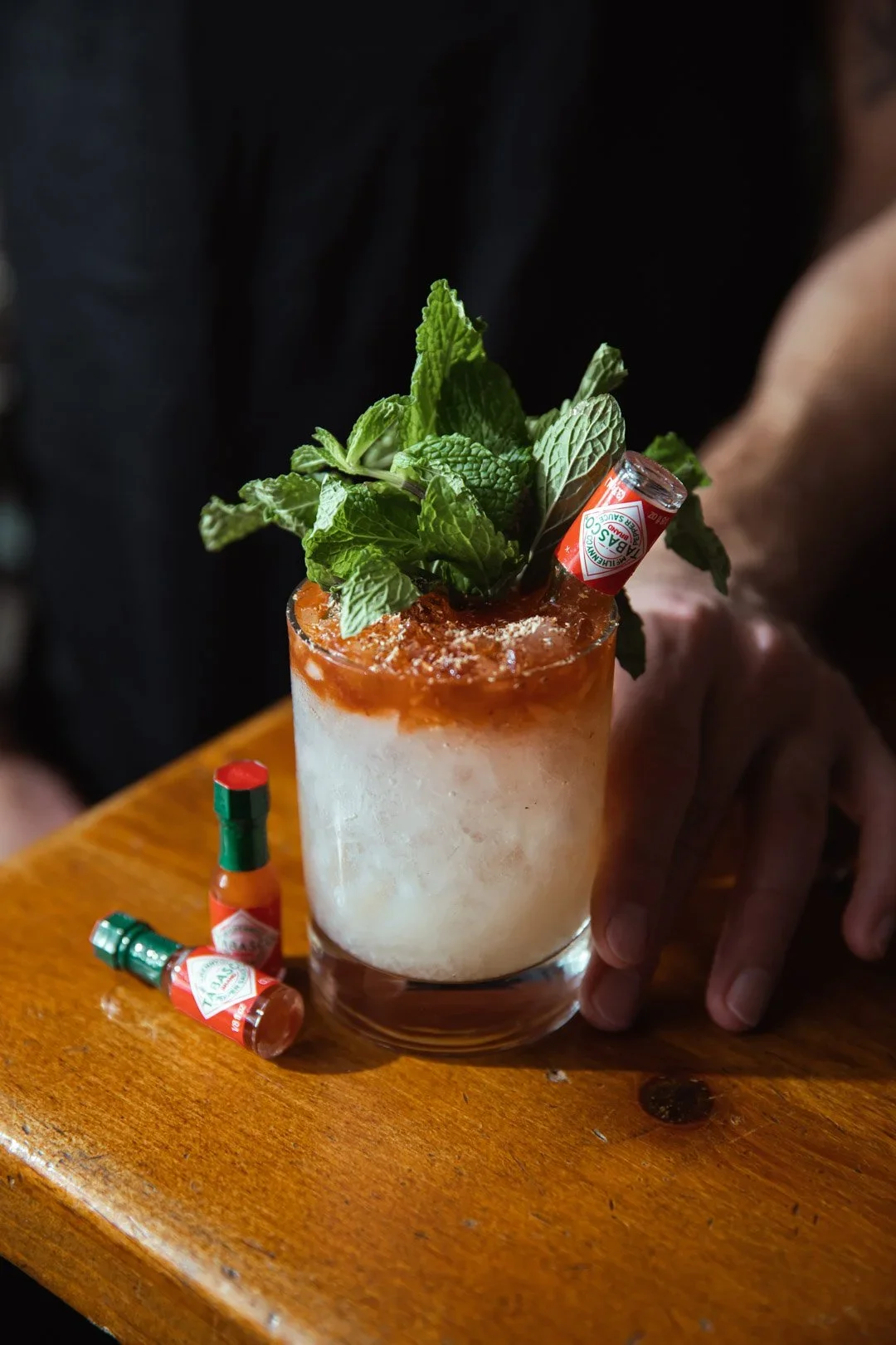 OPTIONAL: Garnish with a mini Tabasco bottle